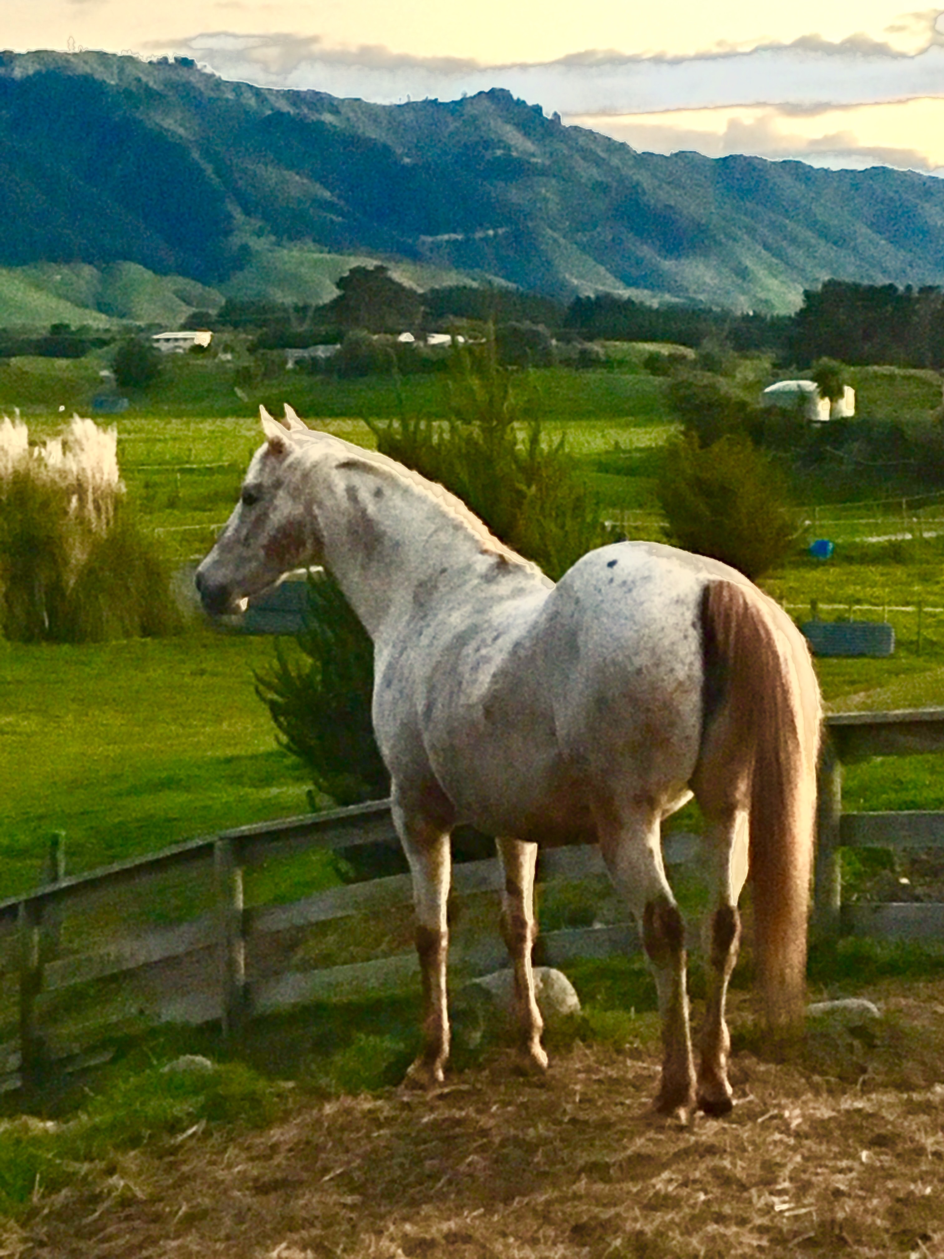 Magic, being claustrophobic but brave, rushed in as well and just wanted everyone else to leave. She couldn’t get near me in the middle with McCoy flexing his muscles (he recently learned ‘crunches’ it’s still his fave thing) and Joe especially with his huge presence. So she pranced around the outside, crossing my line of vision again and again. Then I realised what she was doing! It was a pattern. She would circle the outside, then stop dramatically as if seeing ‘something out there!’ And stand staring at a gap between the trees. Then she looked at me. Then take a step or two towards it. Then glance at me. Each time she ended up pressed against the fence in her ‘famous last word’ position, staring out, before doing it all over again.