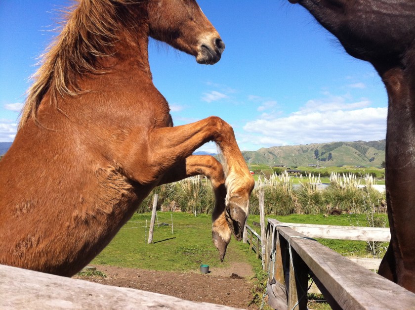 If it’s more violent and if you feel unsafe; know that the horse does too, and do both of you a favour and start from behind a fence- protected contact.